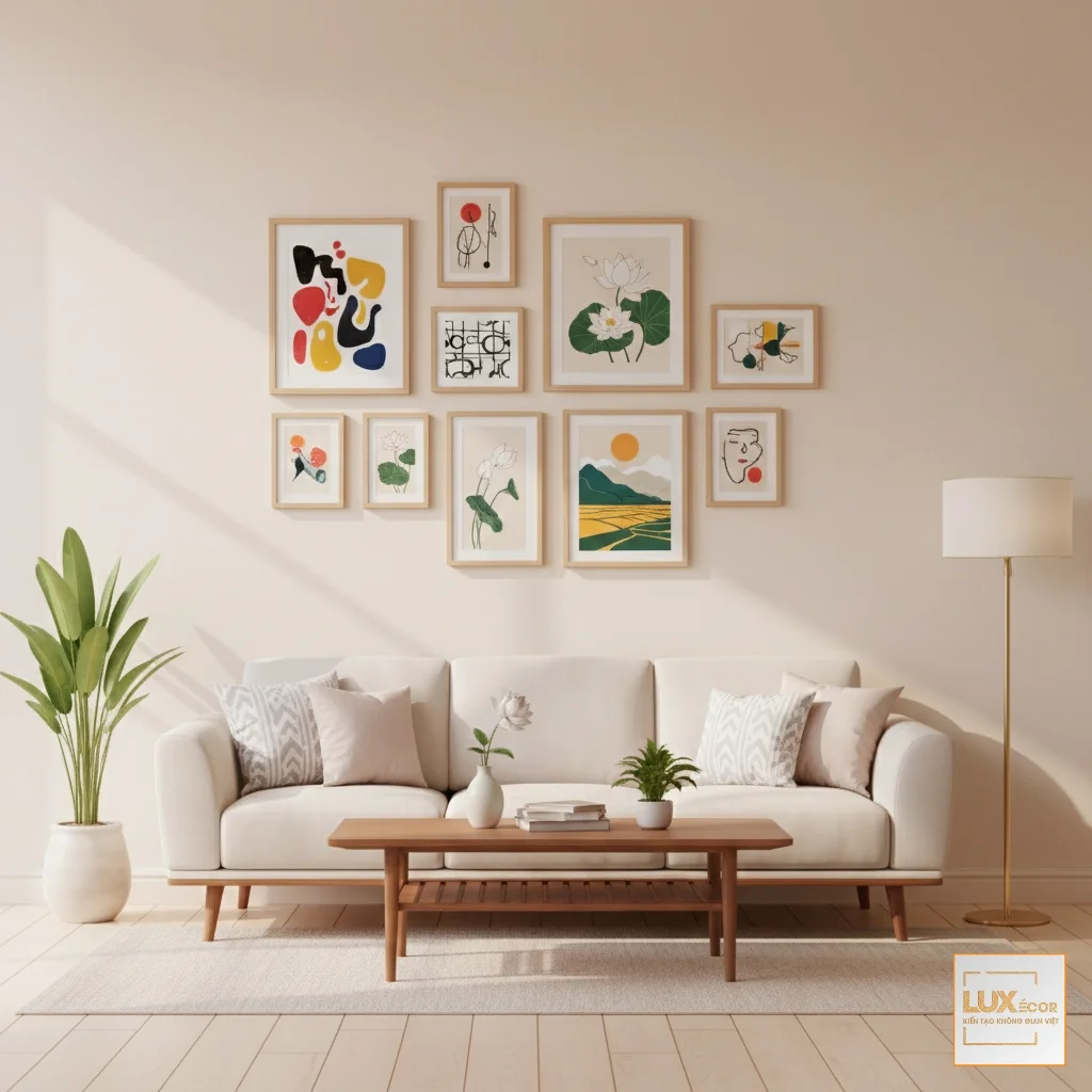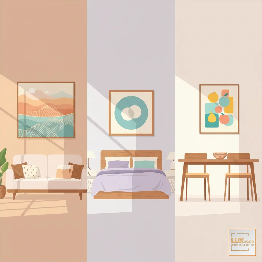 Ví dụ thực tế từ LUXECOR: Một khách hàng có căn hộ phong cách Scandinavian nhưng lại rất thích một bức tranh sơn mài hoa văn cổ điển. Thay vì từ chối, đội ngũ LUXECOR đã tư vấn khách hàng “hiện đại hóa” ý tưởng đó bằng cách thiết kế một bộ ba tranh canvas in UV họa tiết hoa sen cách điệu trên nền màu trắng xám. Kết quả là bức tranh vừa giữ được chủ đề khách yêu thích, vừa hòa hợp hoàn hảo với không gian Bắc Âu. Đây là minh chứng cho thấy sự tư vấn chuyên nghiệp có thể dung hòa sở thích cá nhân và nguyên tắc thiết kế.