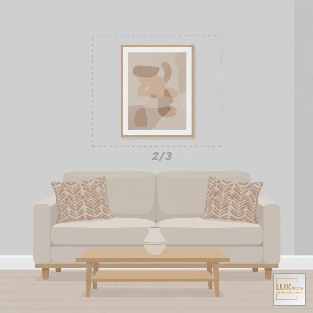 Minh họa quy tắc 2/3 khi treo tranh trên ghế sofa