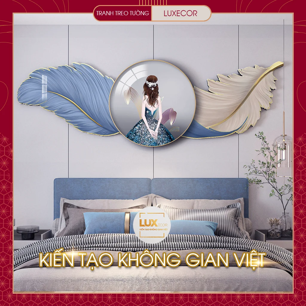 Tranh đèn trang trí lông vũ ôm mặt trăng tráng gương treo tường LUXECOR