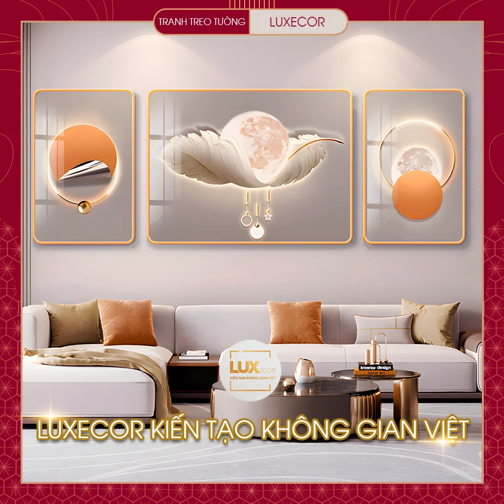 Tranh Tráng Gương Lông Vũ Ôm Mặt Trăng Bộ 3 Bức Ghép Treo Tường Trang Trí Phòng Khách LUXECOR