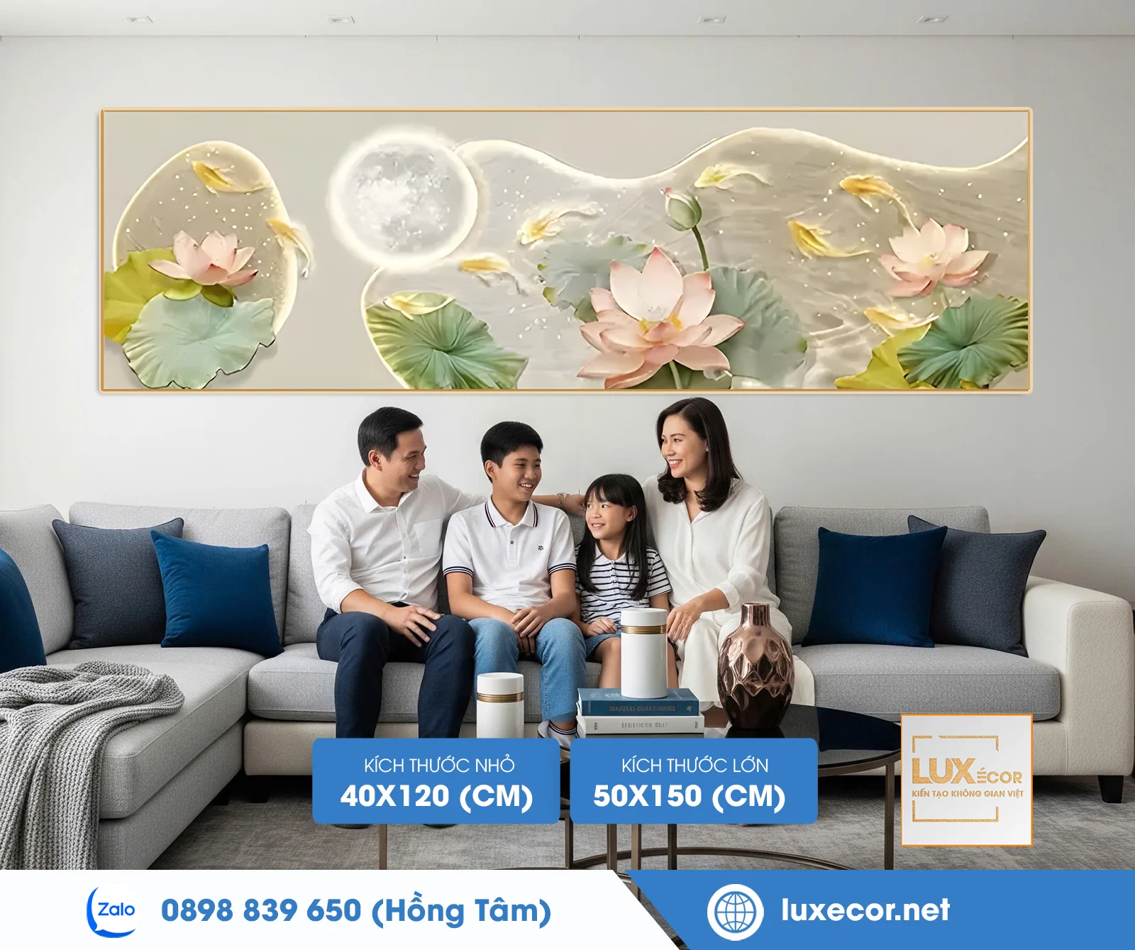 Tranh được Luxecor cung cấp với nhiều kích thước cơ bản để khách hàng dễ dàng lựa chọn theo nhu cầu treo phòng khách, phòng ngủ hay làm quà tặng phong thủy: