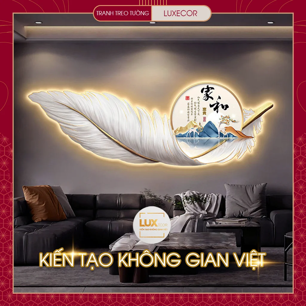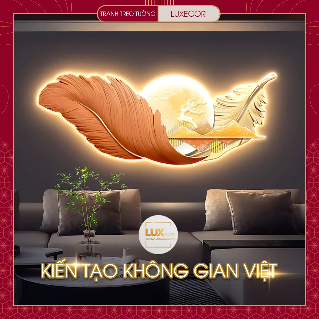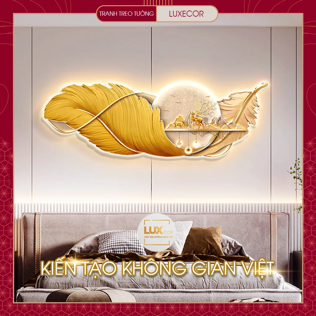 Ảnh thực tế tranh tráng gương đèn LED lông vũ hươu nai tài lộc LUXECOR