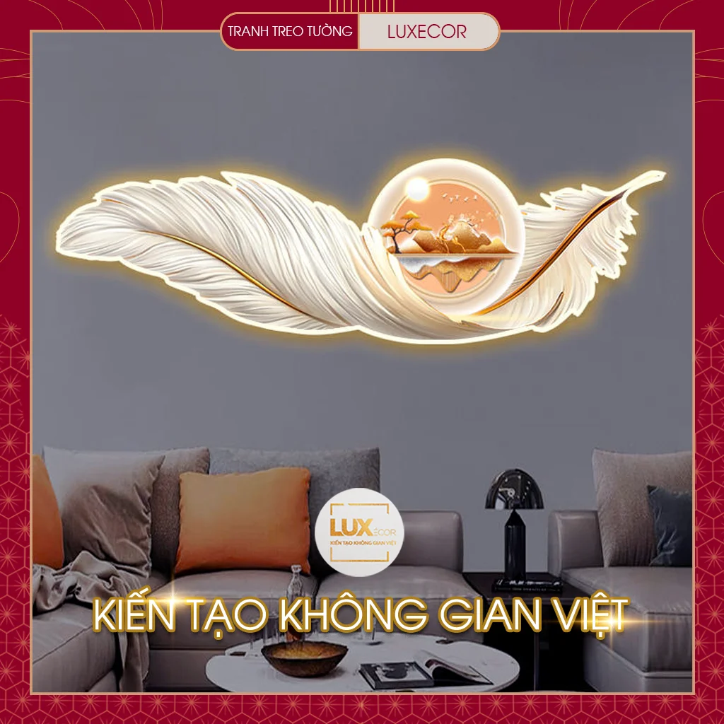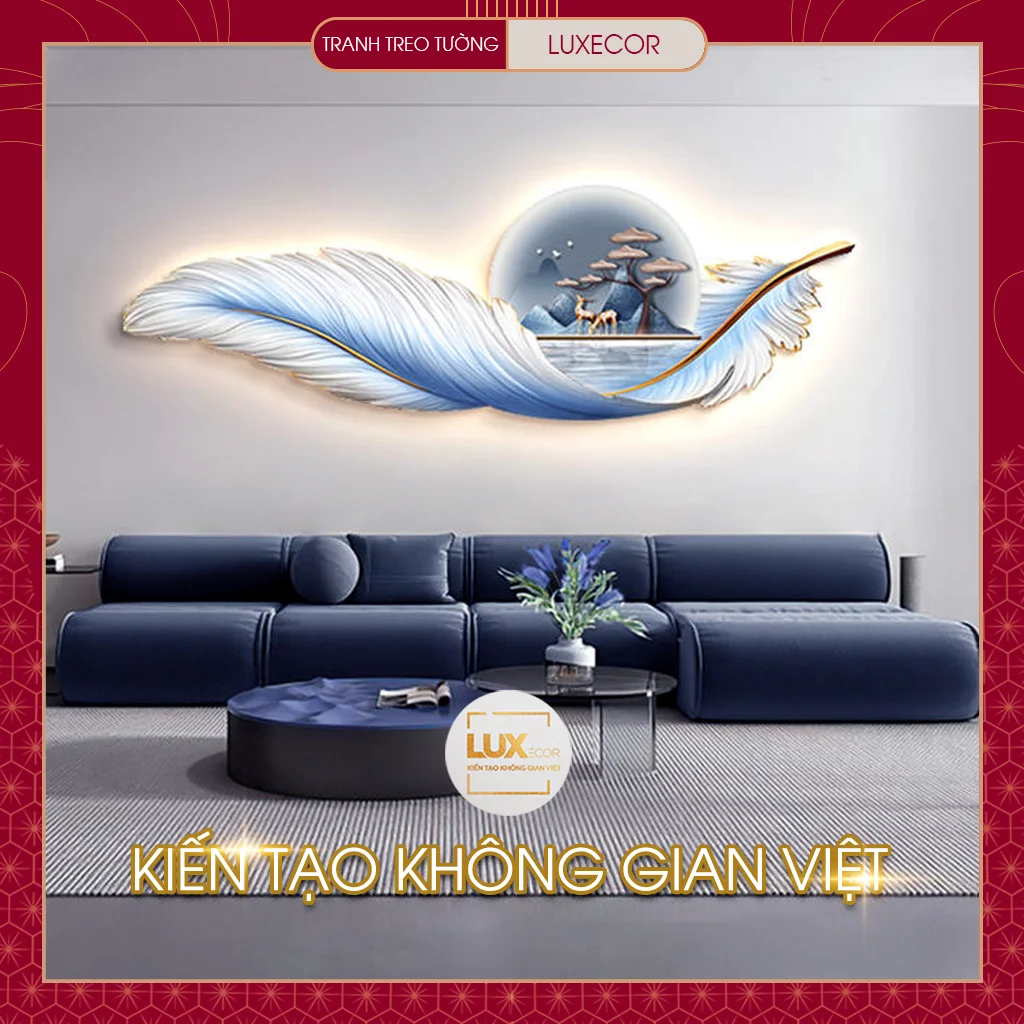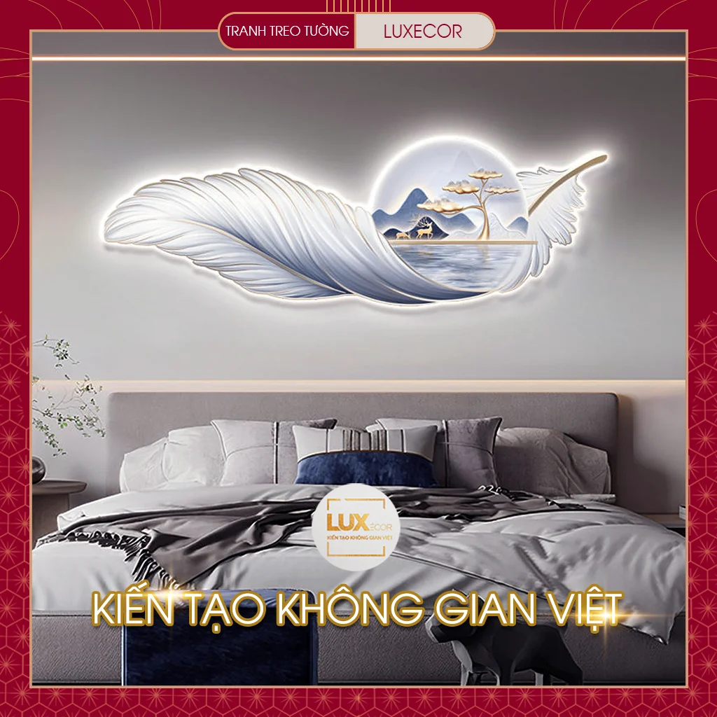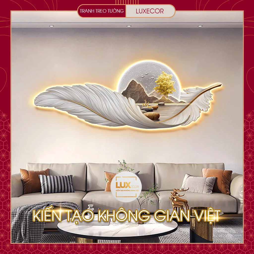 Ảnh thực tế tranh tráng gương đèn LED lông vũ hươu nai tài lộc LUXECOR