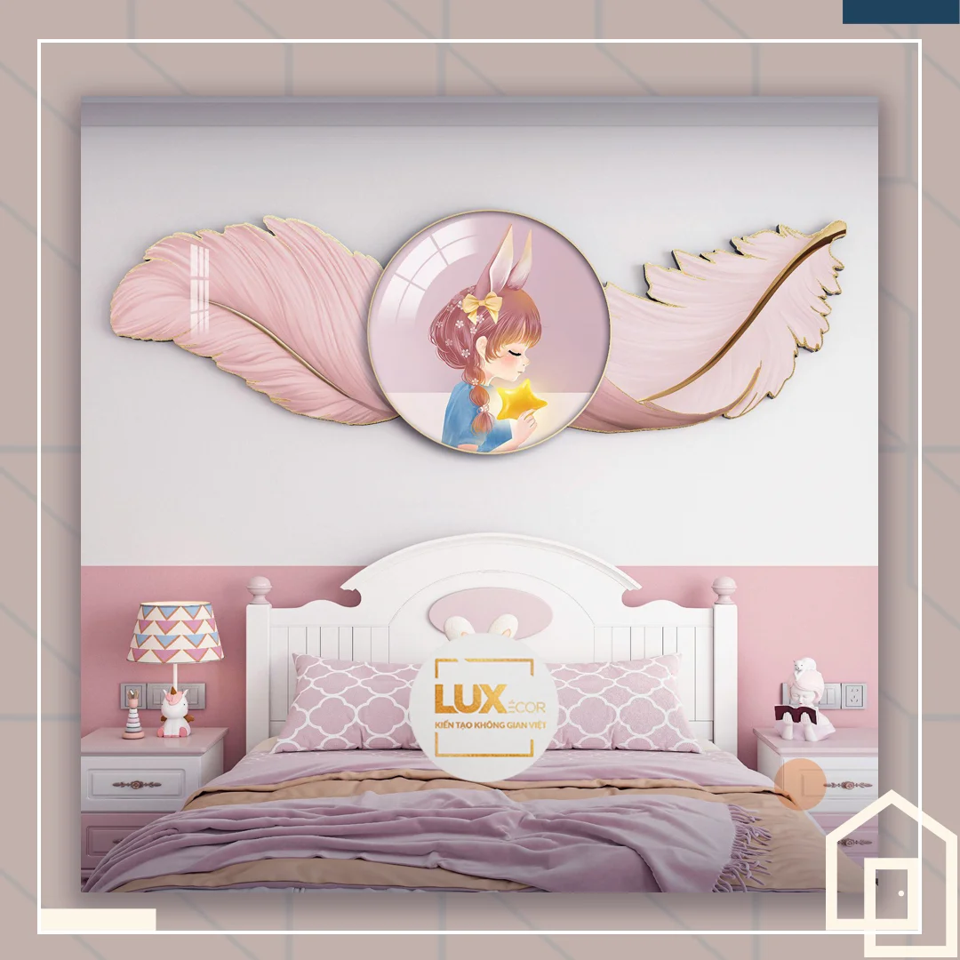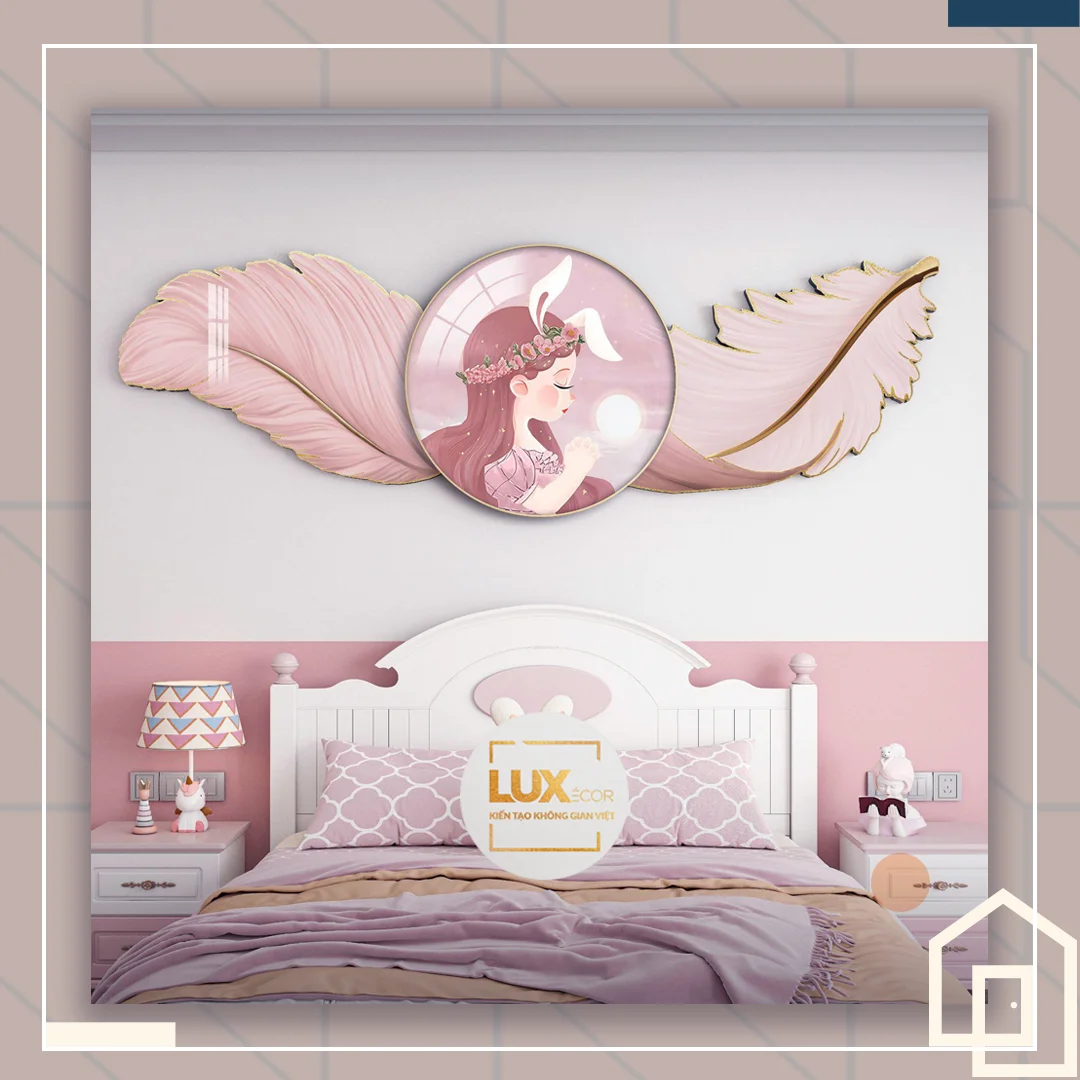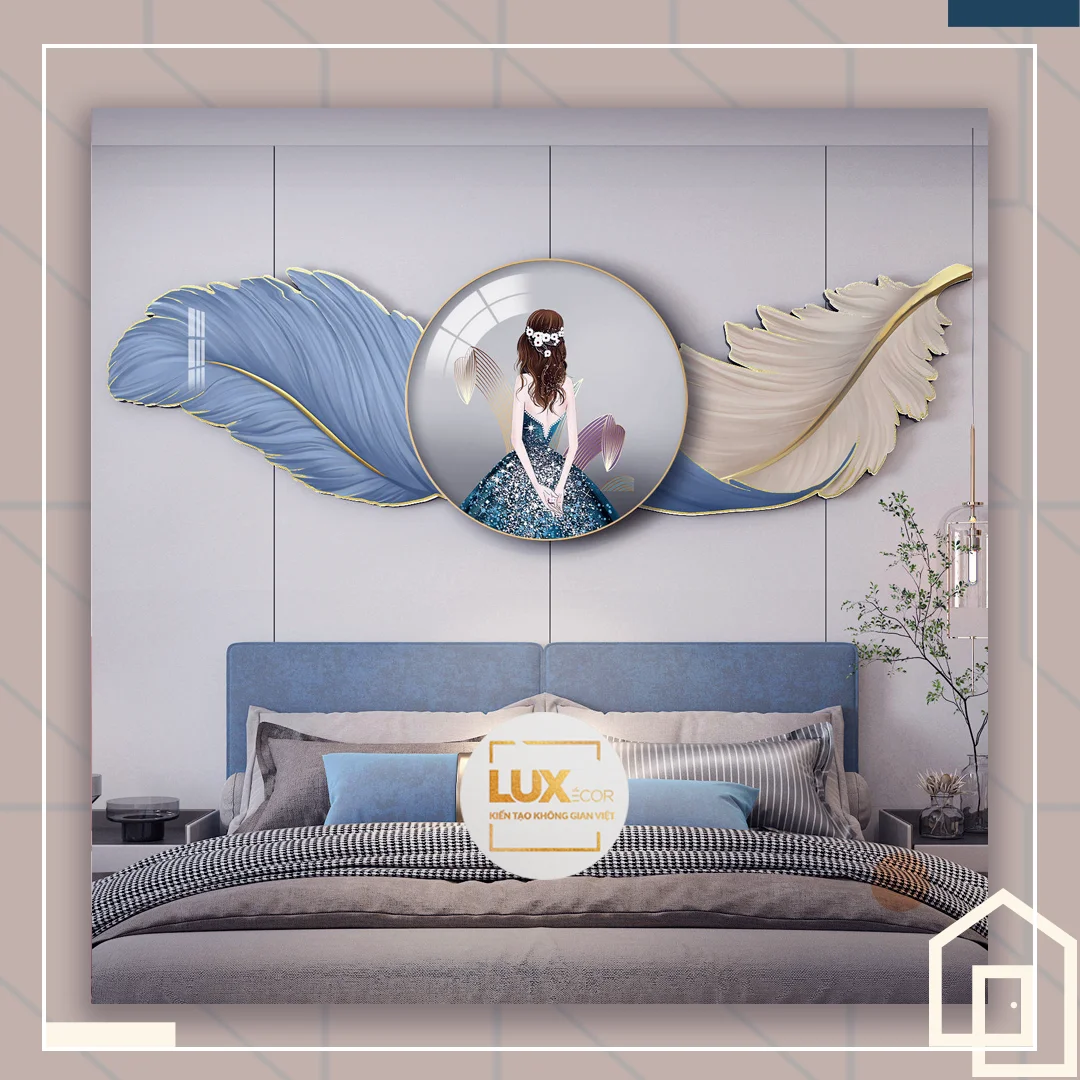 Tranh tráng gương điện đèn led cắt treo tường cô gái lông vũ huyền bí nghệ thuật hiện đại decor phòng nữ tính LUX-LV