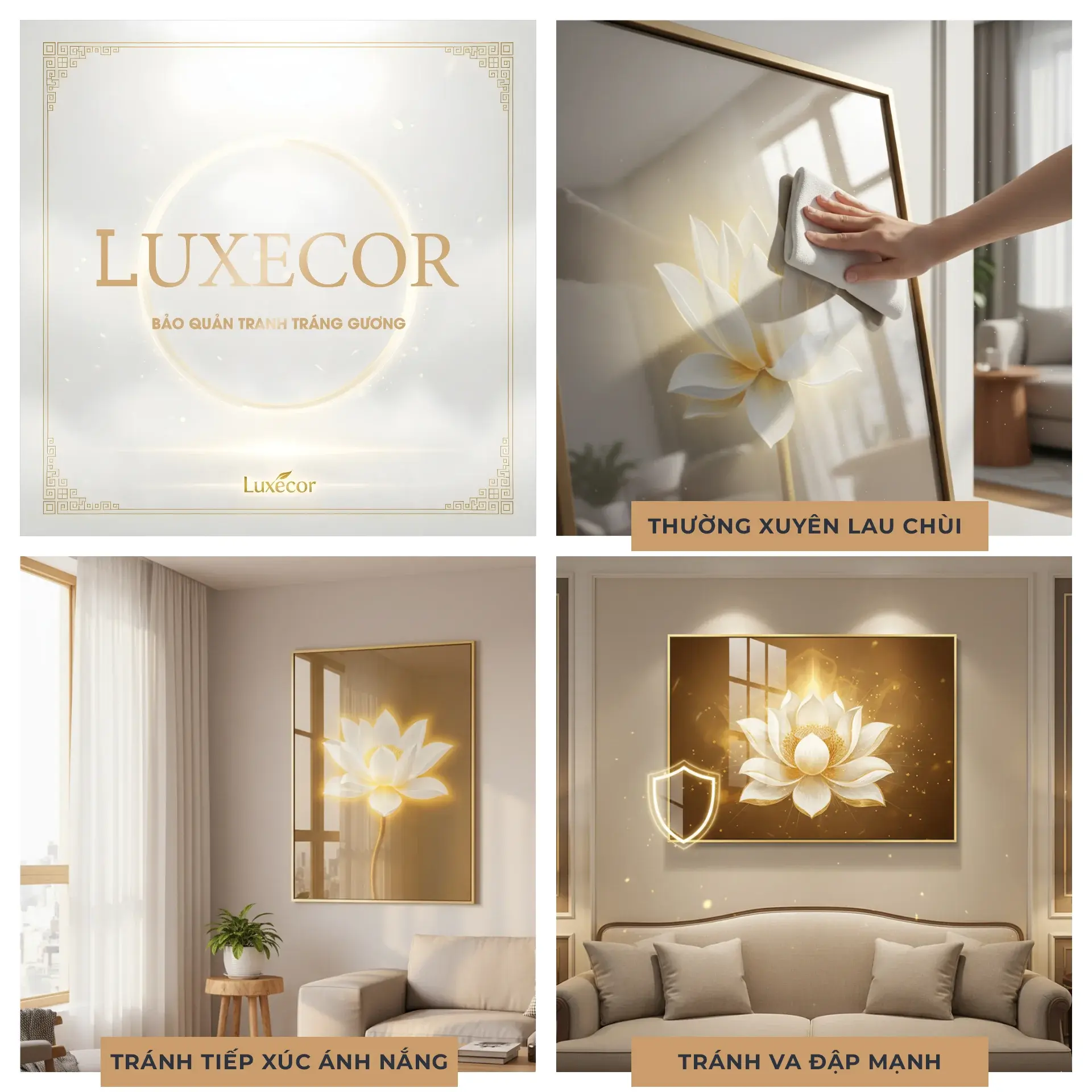 Cách bảo quản tranh tráng gương Luxecor hiệu quả: lau chùi bằng khăn mềm, tránh ánh nắng trực tiếp và hạn chế va đập để giữ vẻ đẹp sang trọng lâu dài.