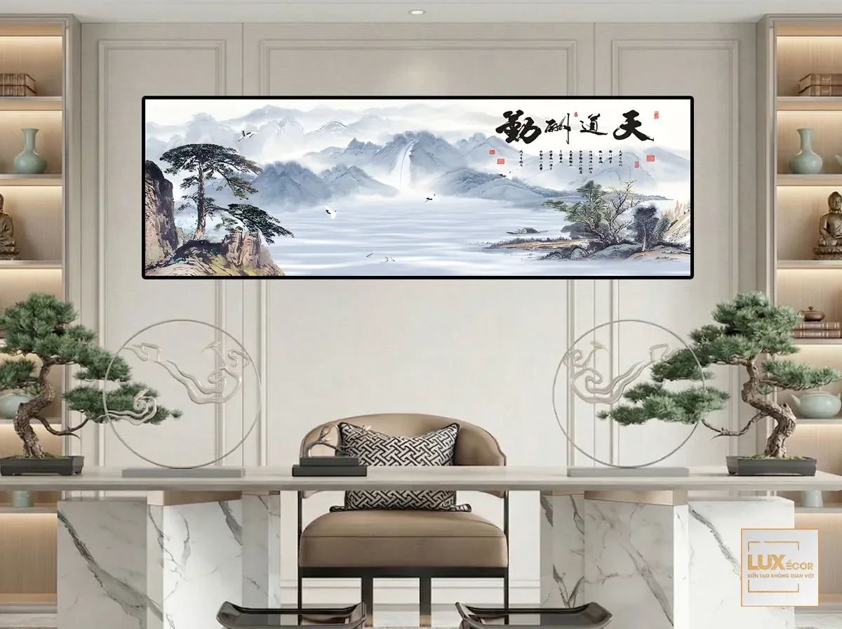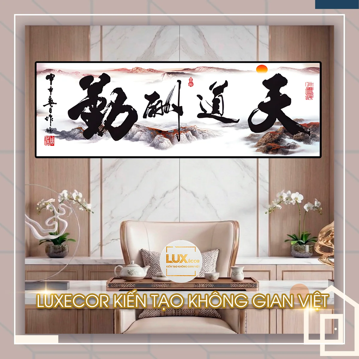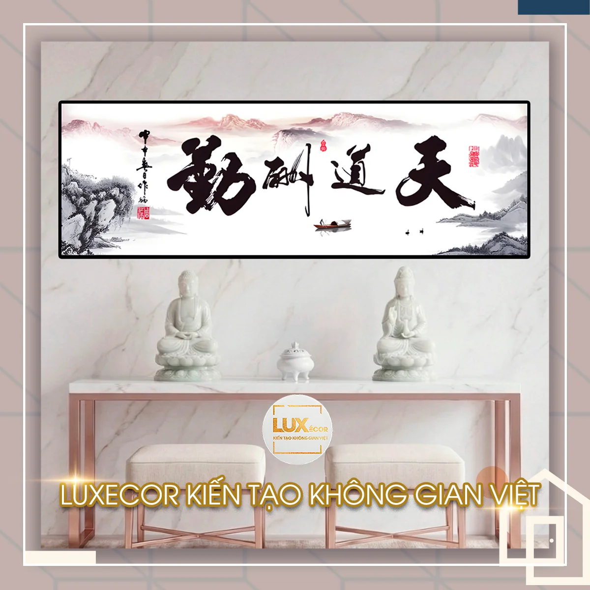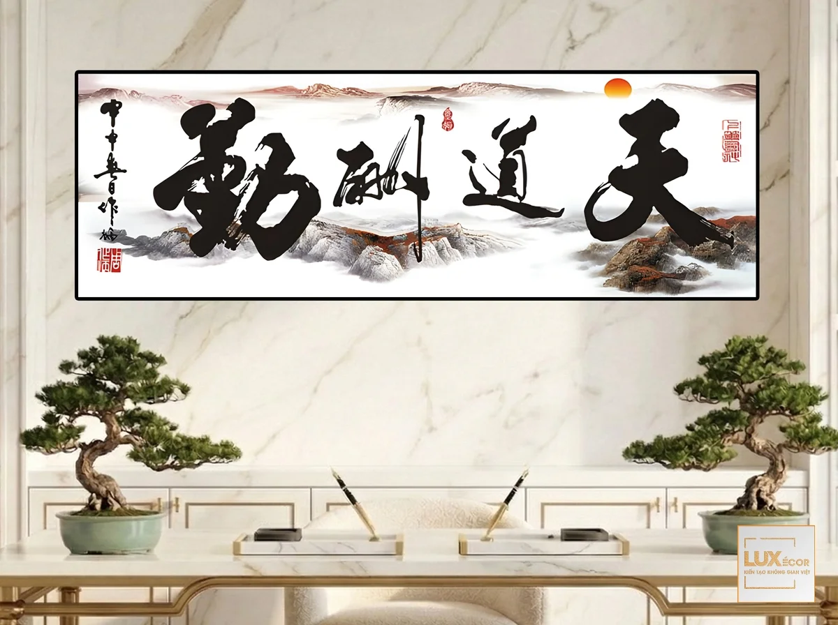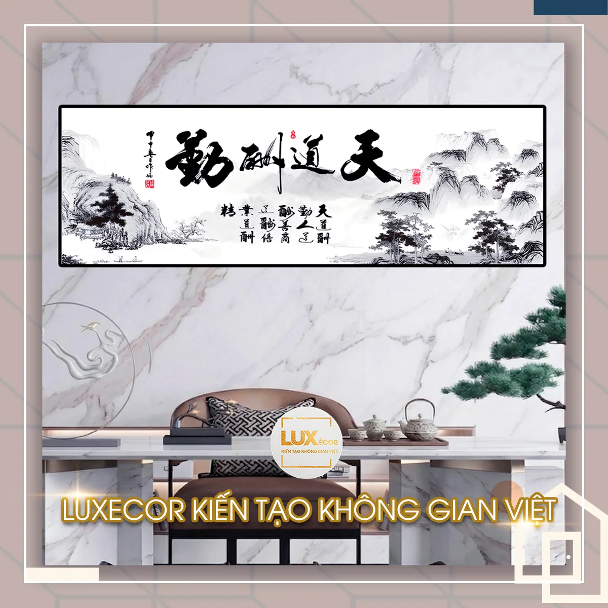 - Mẫu LUX-4013: Thiên Đạo Thù Cần (天道酬勤) thủy mặc tối giản: Chữ thư pháp nổi bật trên nền núi non thoắt ẩn thoắt hiện trong sương mờ. Bức tranh toát lên vẻ đẹp nguyên sơ, thanh tịnh, giúp tâm trí tập trung cao độ vào mục tiêu.