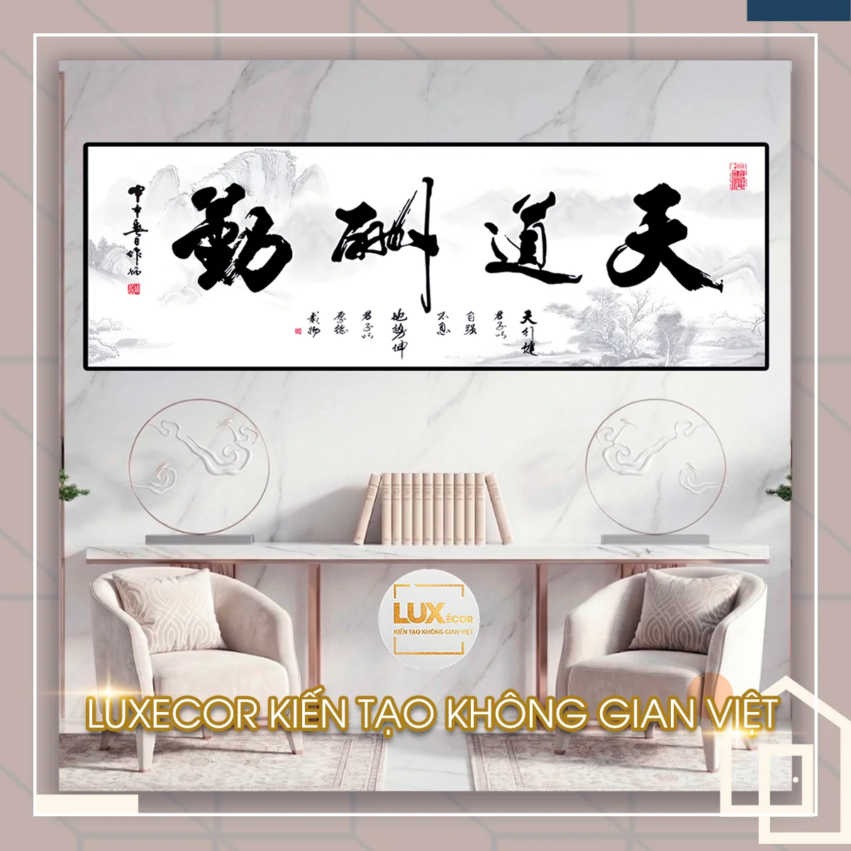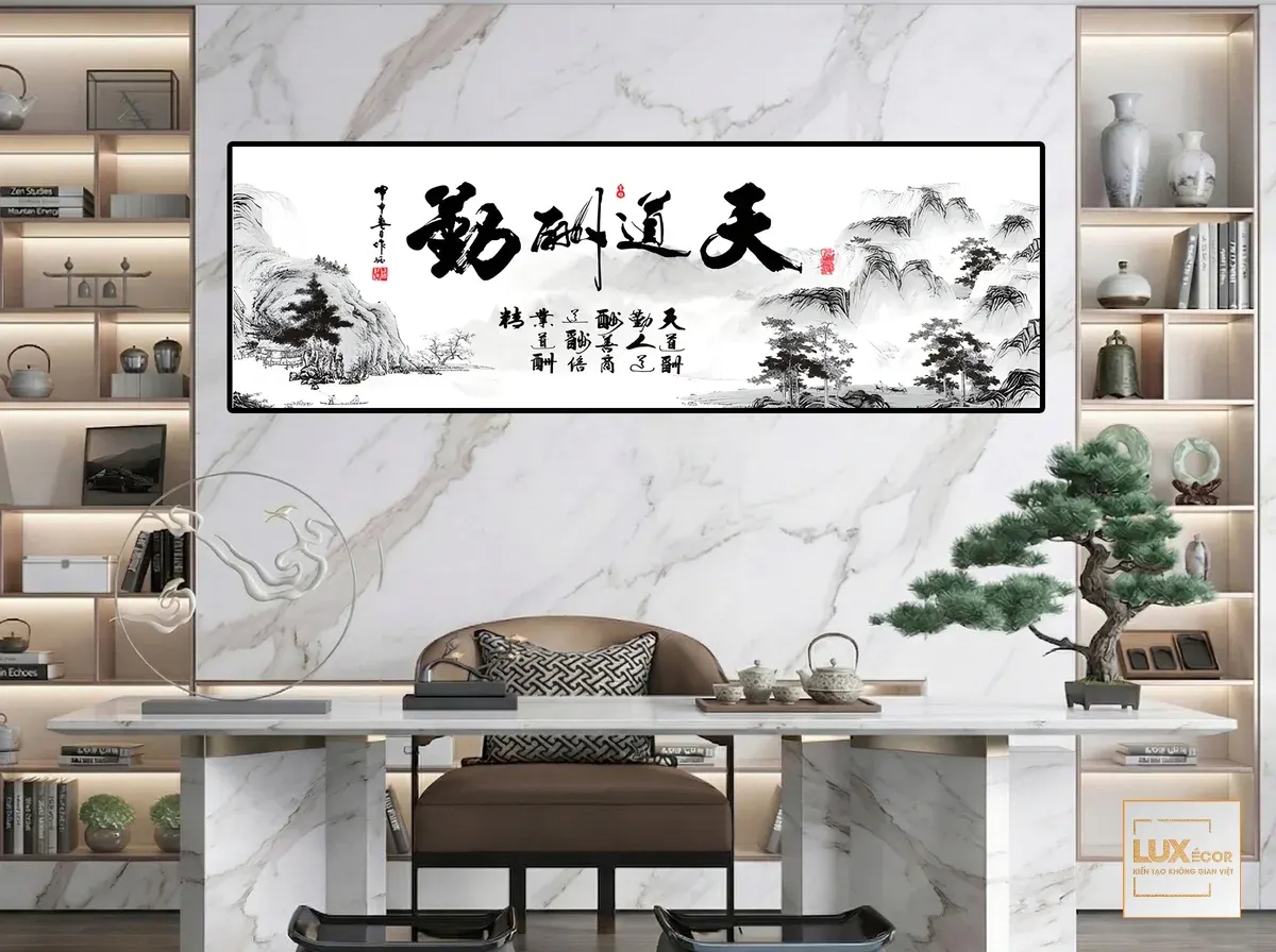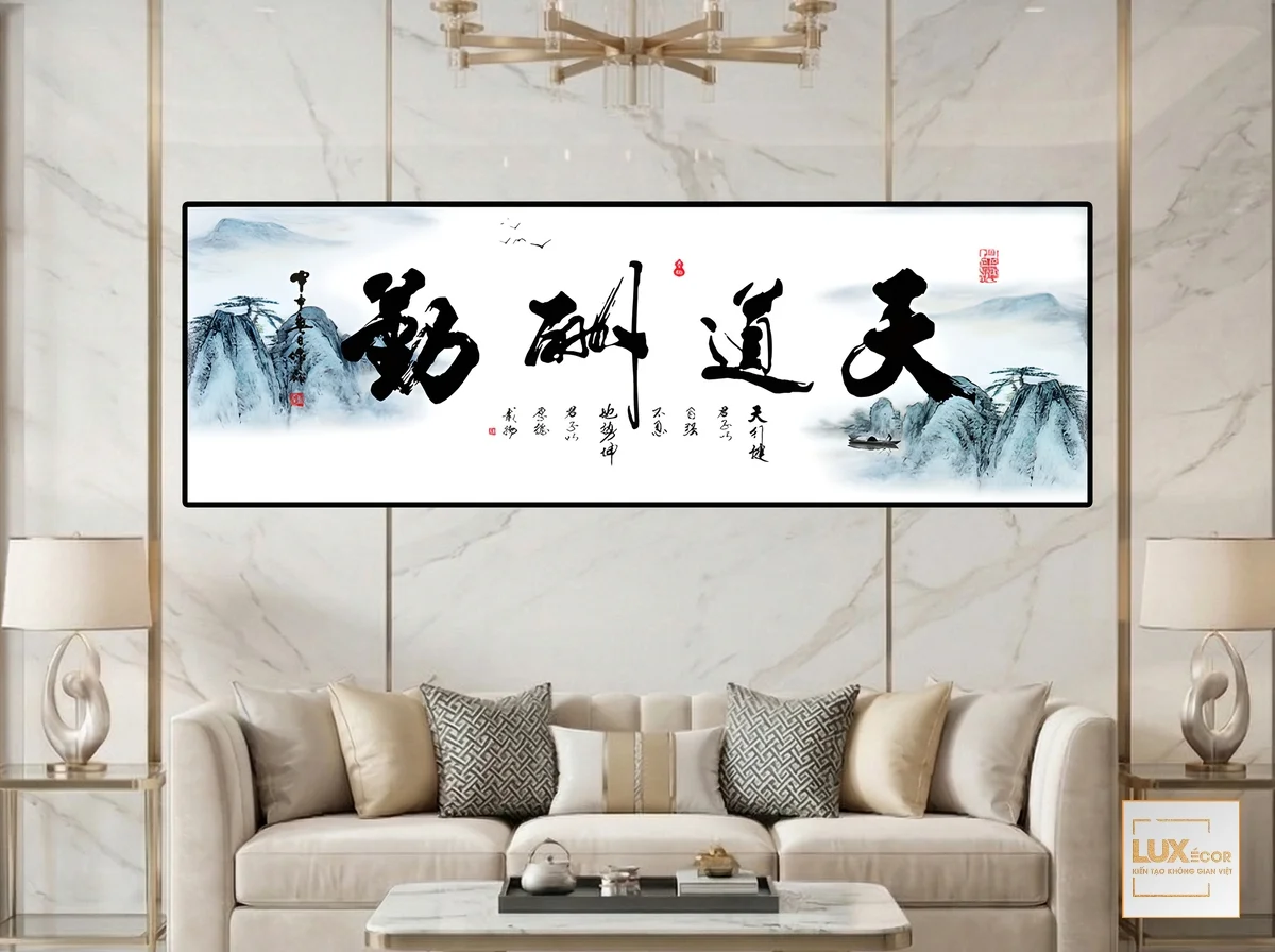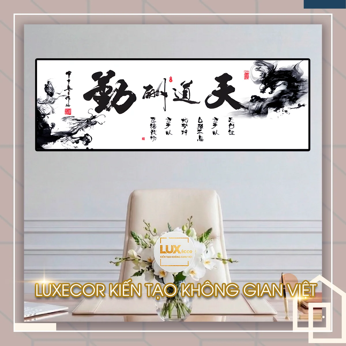 - Mẫu LUX-4013: Thiên Đạo Thù Cần (天道酬勤) thủy mặc tối giản: Chữ thư pháp nổi bật trên nền núi non thoắt ẩn thoắt hiện trong sương mờ. Bức tranh toát lên vẻ đẹp nguyên sơ, thanh tịnh, giúp tâm trí tập trung cao độ vào mục tiêu.