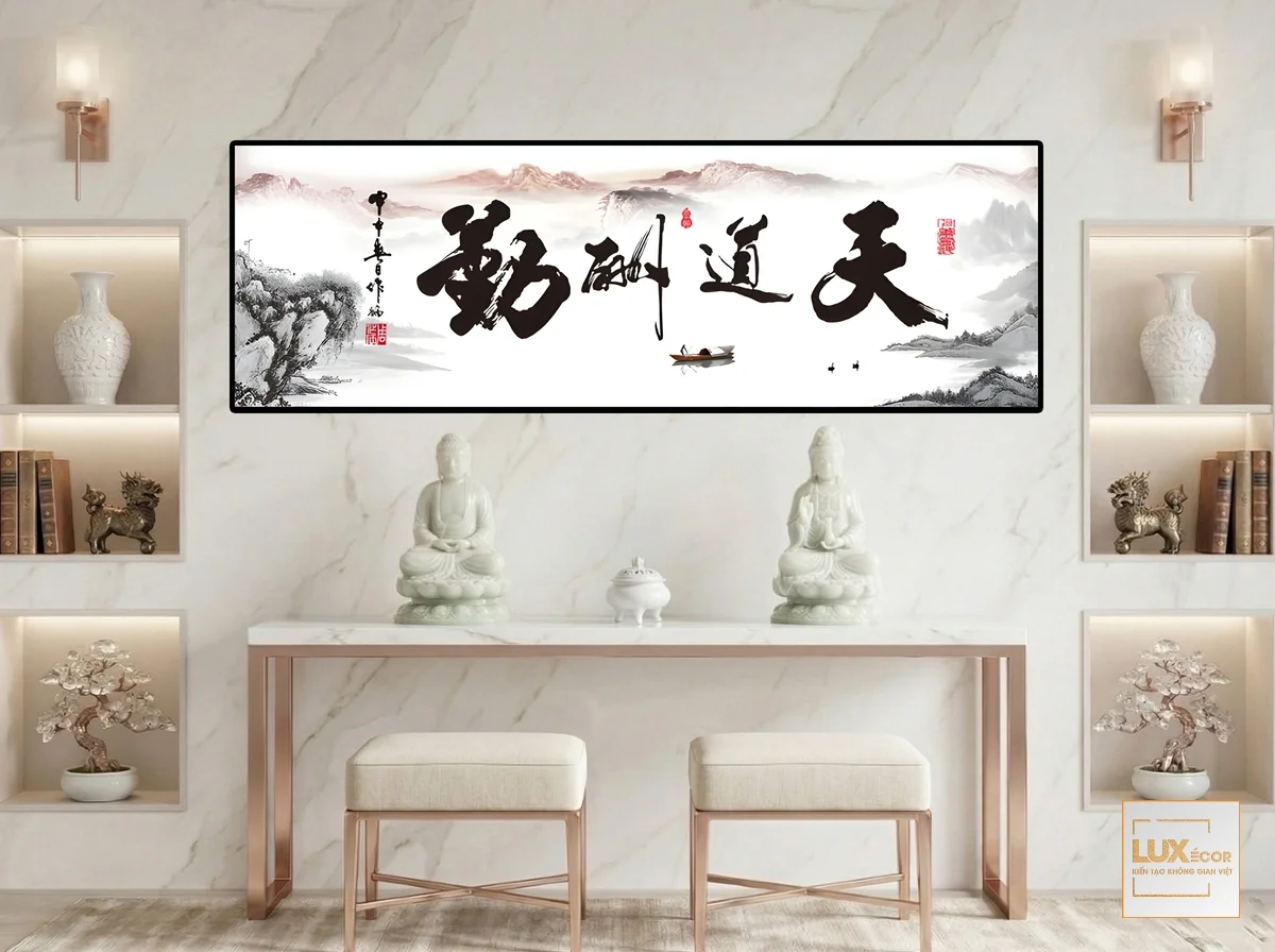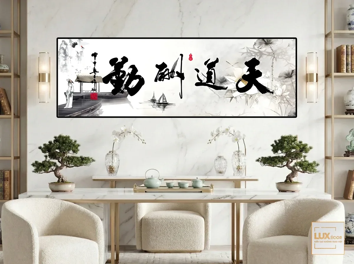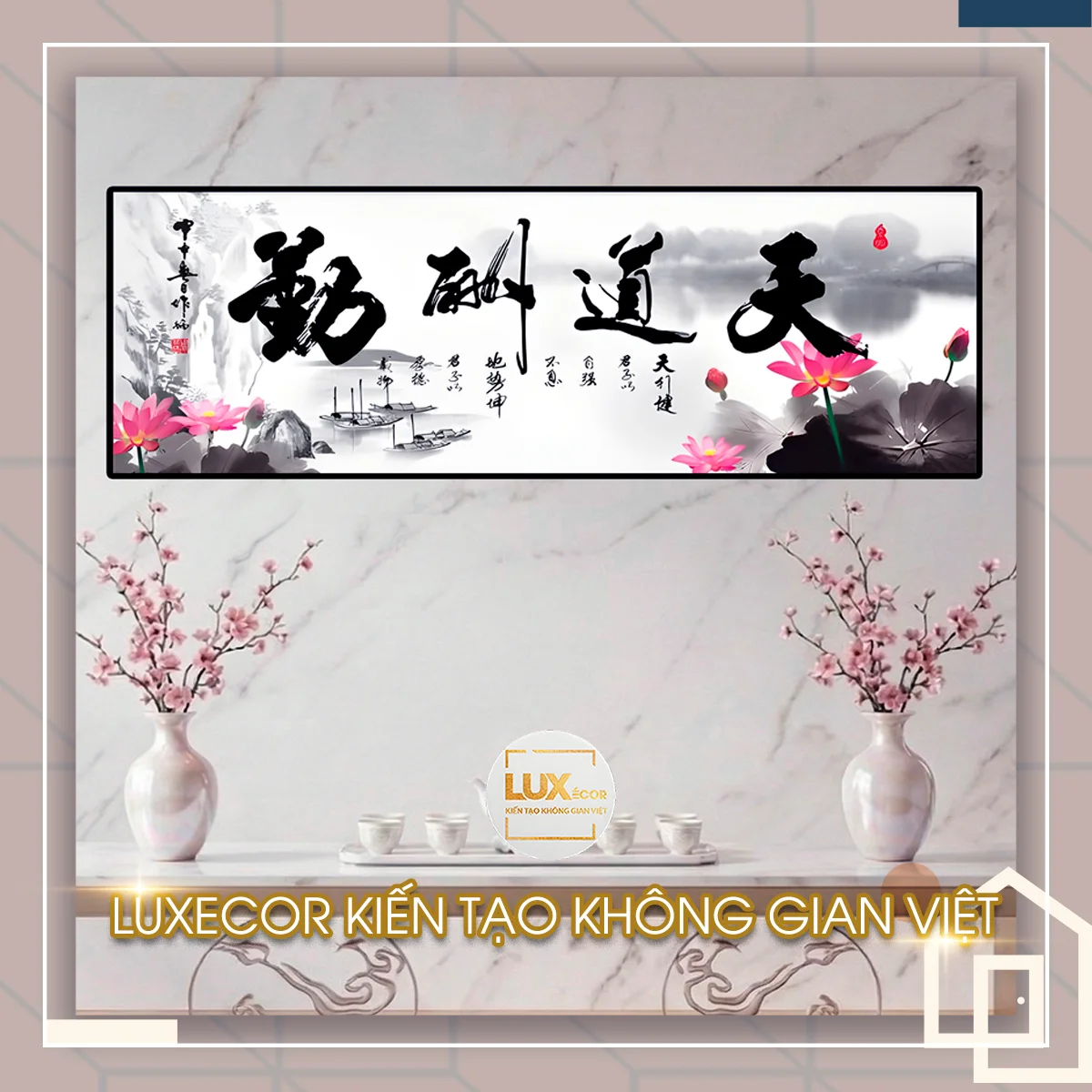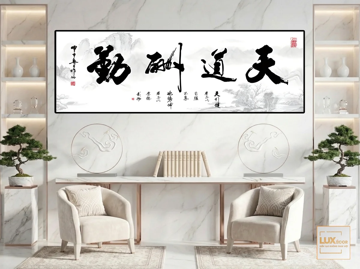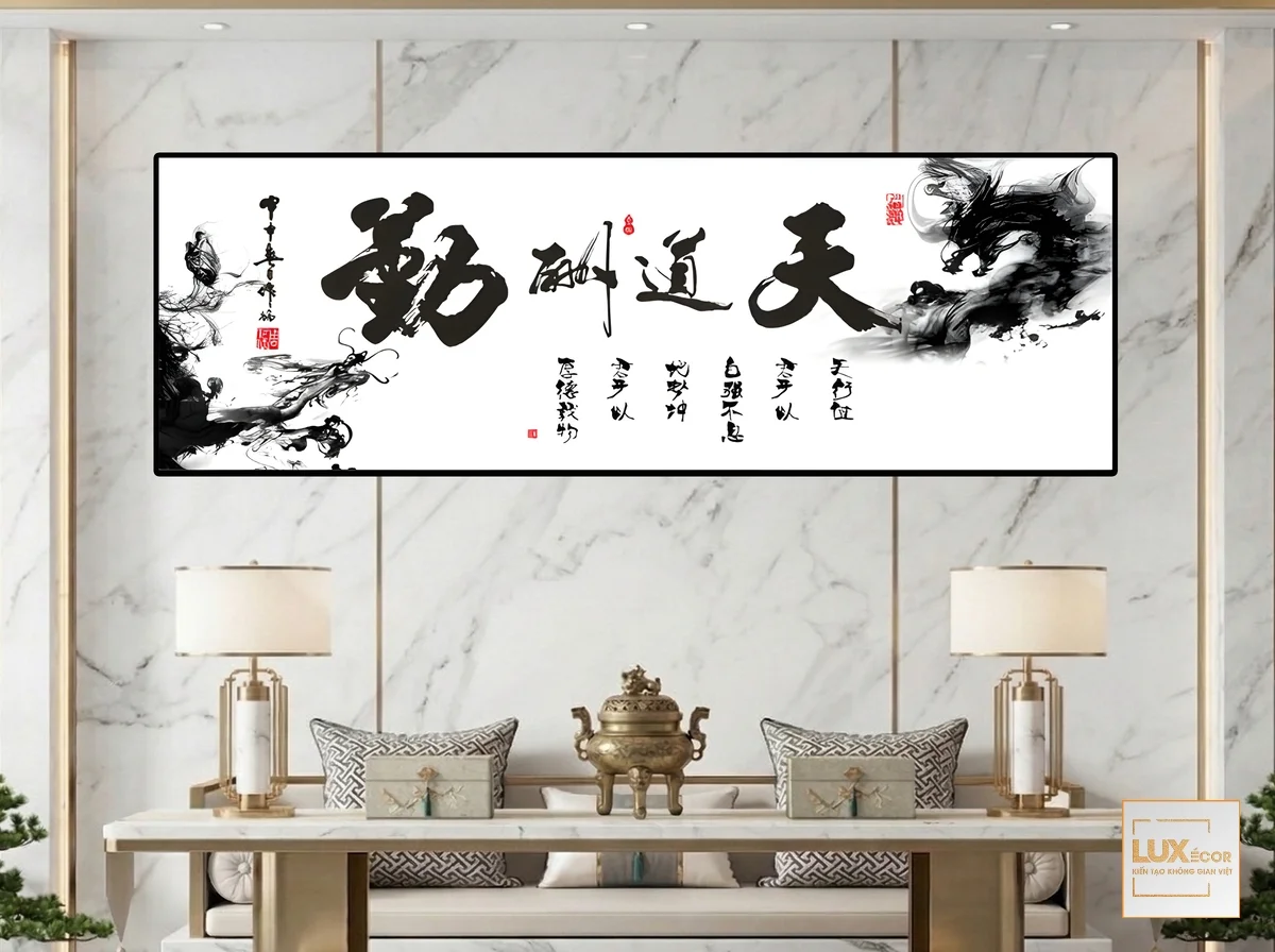 - Mẫu LUX-4013: Thiên Đạo Thù Cần (天道酬勤) thủy mặc tối giản: Chữ thư pháp nổi bật trên nền núi non thoắt ẩn thoắt hiện trong sương mờ. Bức tranh toát lên vẻ đẹp nguyên sơ, thanh tịnh, giúp tâm trí tập trung cao độ vào mục tiêu.