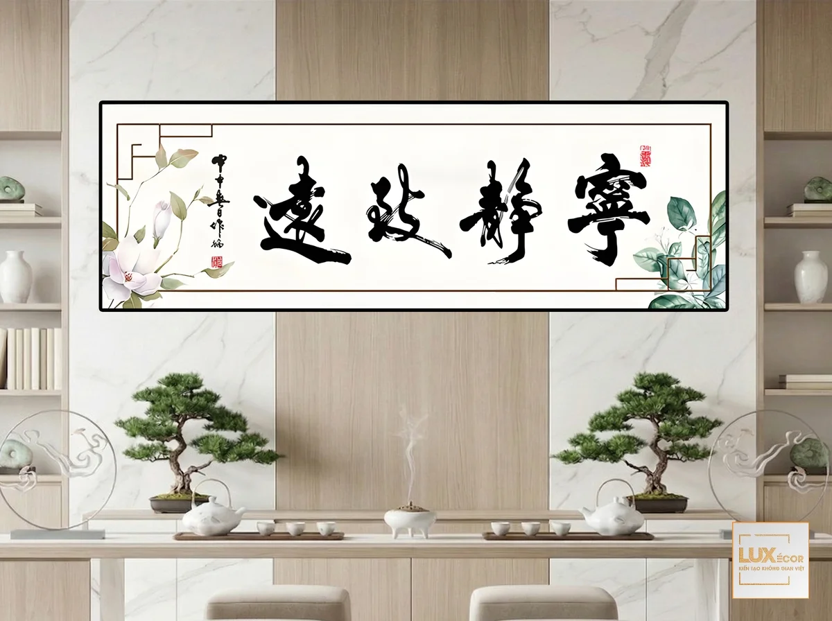 - Mẫu LUX-4018: Ninh Tĩnh Trí Viễn (寧靜致遠) mộc lan tao nhã: Trích từ câu nói kinh điển của Gia Cát Lượng “Tâm tĩnh lặng mới vươn được xa”. Mẫu tranh dùng họa tiết hoa mộc lan trắng và khung viền kỷ hà hiện đại, mang lại vẻ đẹp cực kỳ thanh tao, đẳng cấp.