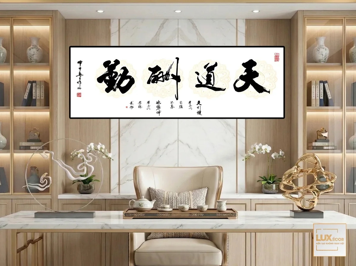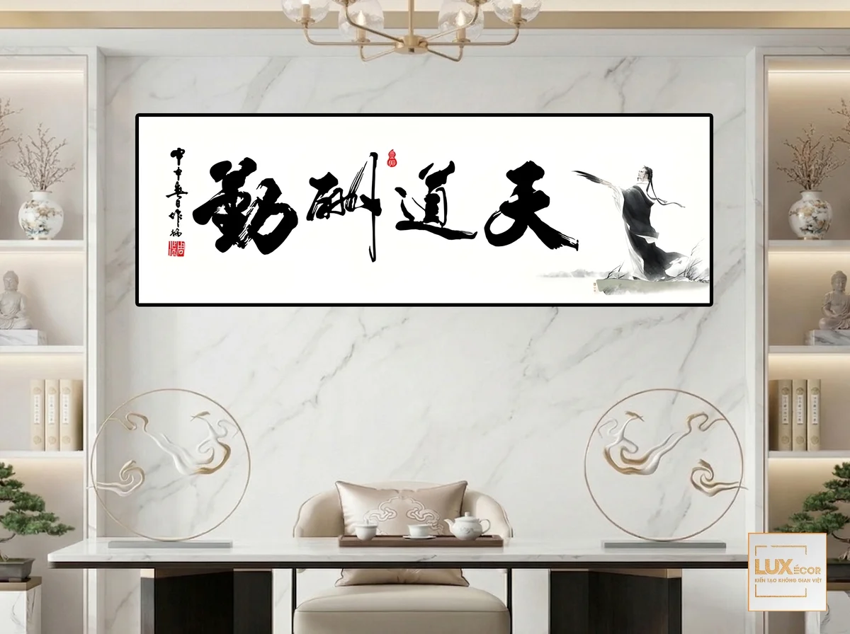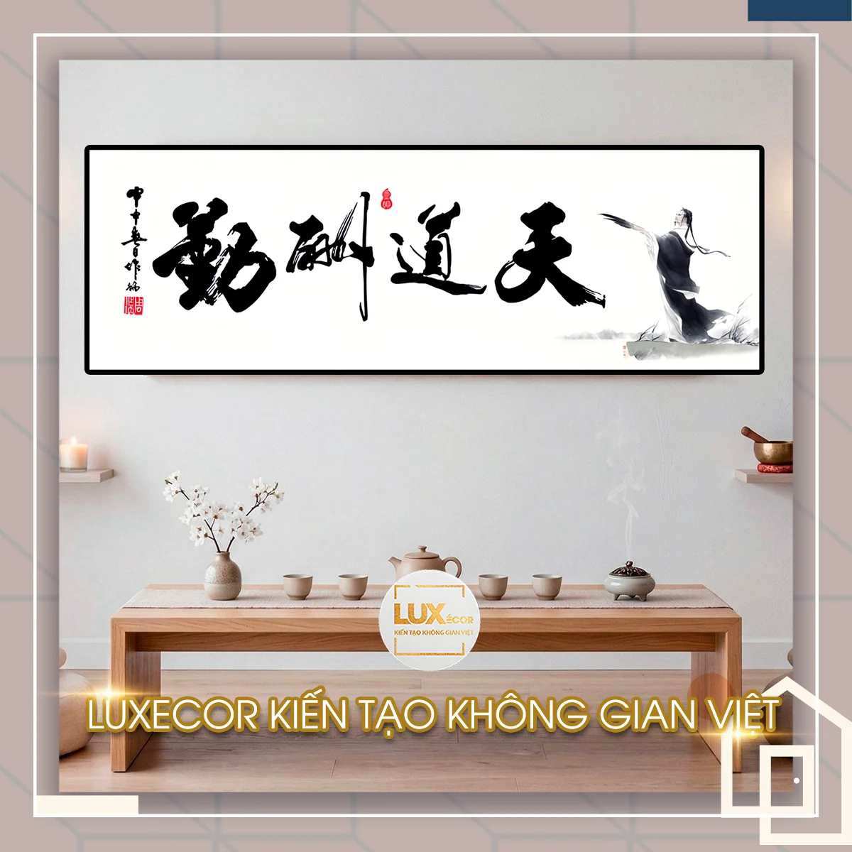 - Mẫu LUX-4009: Thiên Đạo Thù Cần (天道酬勤) bóng dáng Cao nhân: Vẫn là chân lý “Trời thưởng cho người siêng năng”, nhưng được điểm xuyết hình ảnh bậc cao nhân phong thái ung dung, hướng đến sự thành công viên mãn và tự tại.