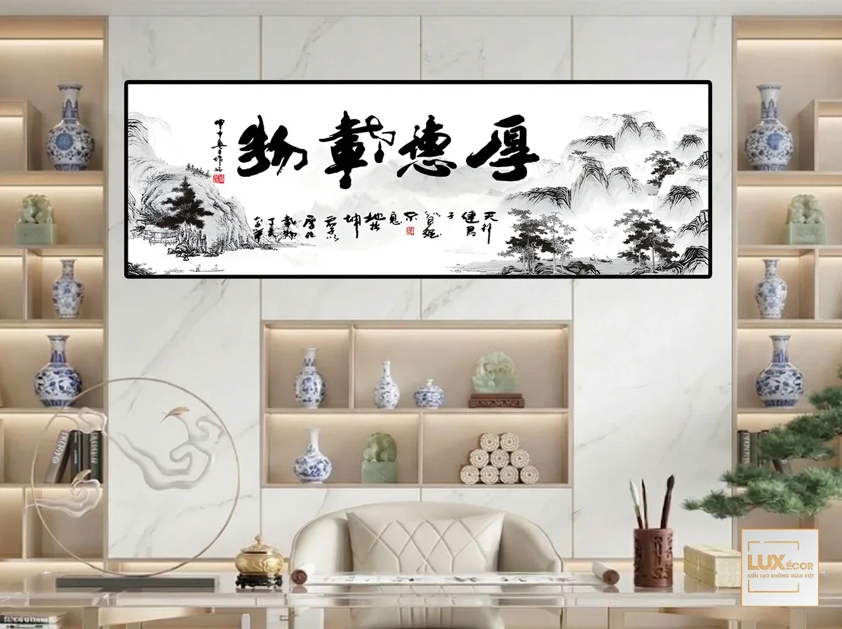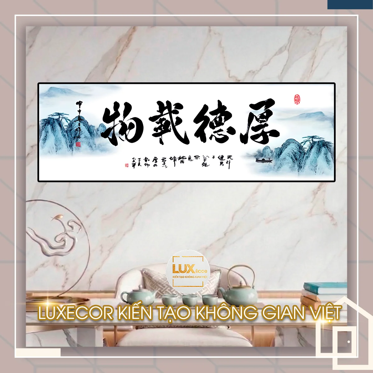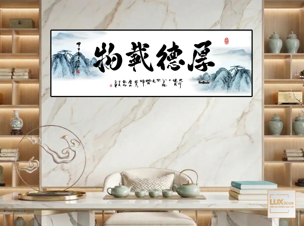 - Mẫu LUX-4002: Hậu Đức Tải Vật (厚德載物) tùng bách: Cùng mang triết lý “Đức dày chở muôn vật”, nhưng bức tranh này kết hợp cảnh đồi thông tùng bách êm đềm, tượng trưng cho sự trường thọ và khí tiết kiên cường của người quân tử.