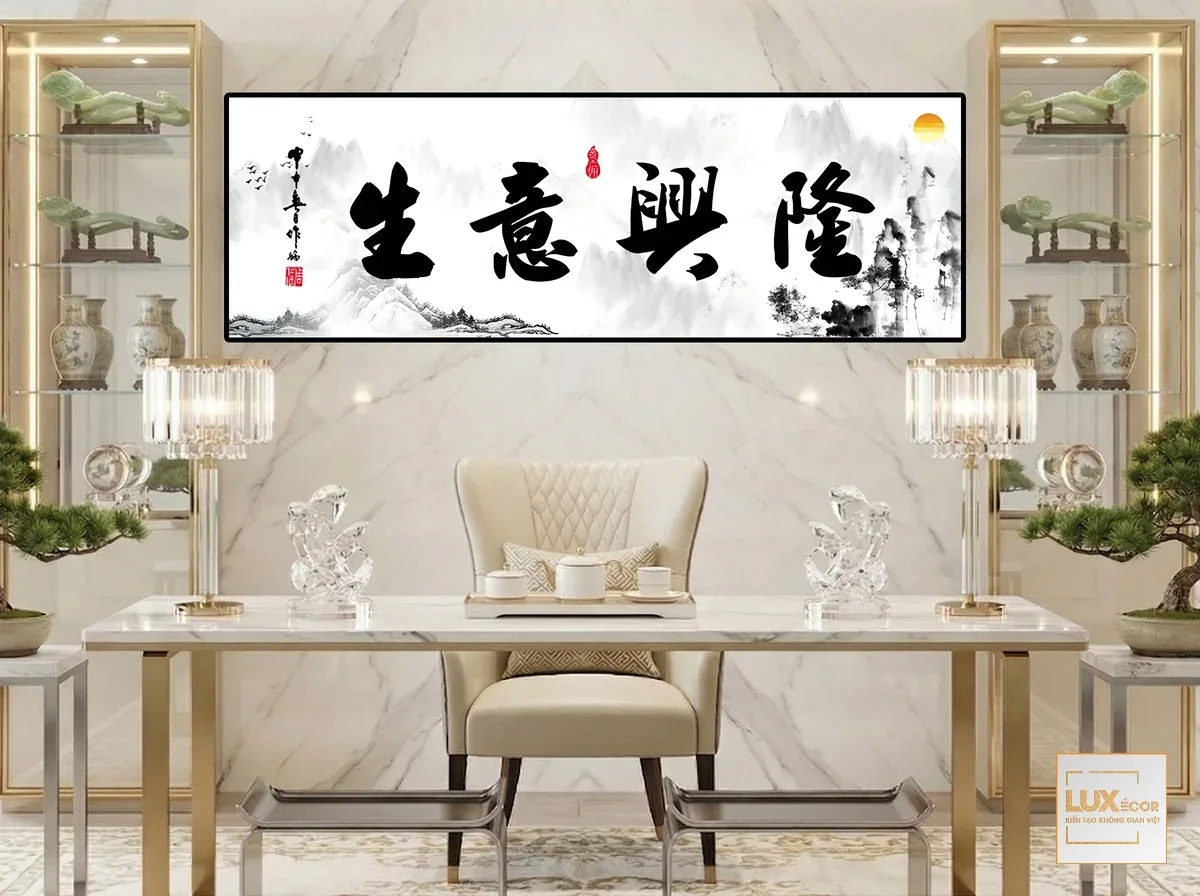 - Mẫu LUX-4006: Sinh Ý Hưng Long (生意興隆): Lời chúc “Mua may bán đắt, kinh doanh phát đạt”. Tác phẩm nổi bật với cảnh bình minh ló rạng trên rặng núi, thu hút sinh khí và tài lộc mạnh mẽ cho doanh nghiệp.