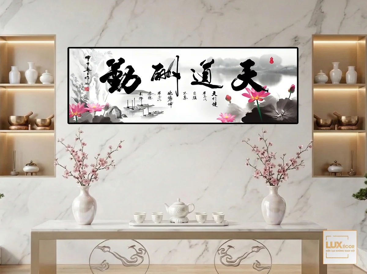 - Mẫu LUX-4017: Thiên Đạo Thù Cần (天道酬勤) sen hồng vượng sắc: Sự kết hợp tinh tế giữa thông điệp nỗ lực và những đóa hoa sen hồng vươn lên từ bùn lầy, mang lại sinh khí tươi mới, sự may mắn và cốt cách thanh cao cho không gian làm việc.
